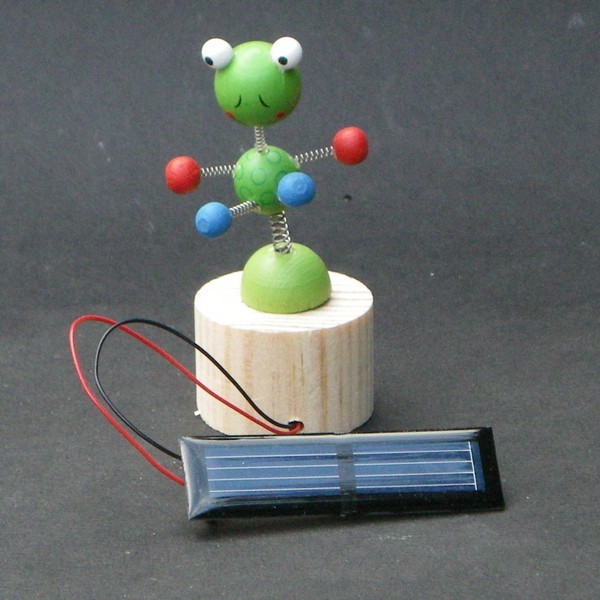 PIECES : 1 petit corps en ressorts composé des jambes et du tronc déjà montés, 1 cellule solaire 0.5v 150mA, 1 moteur 0.5 v et un socle en bois.